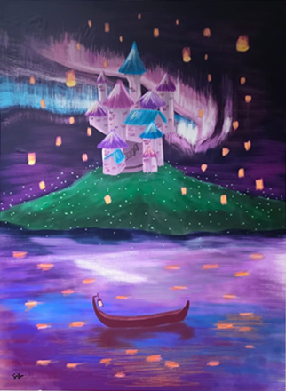 | This artwork expresses my gratitude towards a friend who reached out to me during my low times. It is inspired by this friend’s dream to visit all the Disneylands around the world and see the aurora lights. The floating lanterns, inspired by the Disney movie ‘Rapunzel,’ symbolise hope.