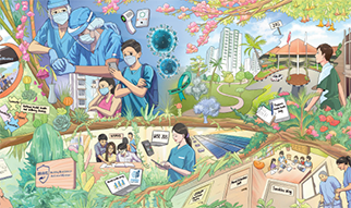 | This mural depicts Singapore's mental health evolution as a continuous tree - from the early days at Woodbridge Hospital to today's community services and tomorrow's innovative care models.